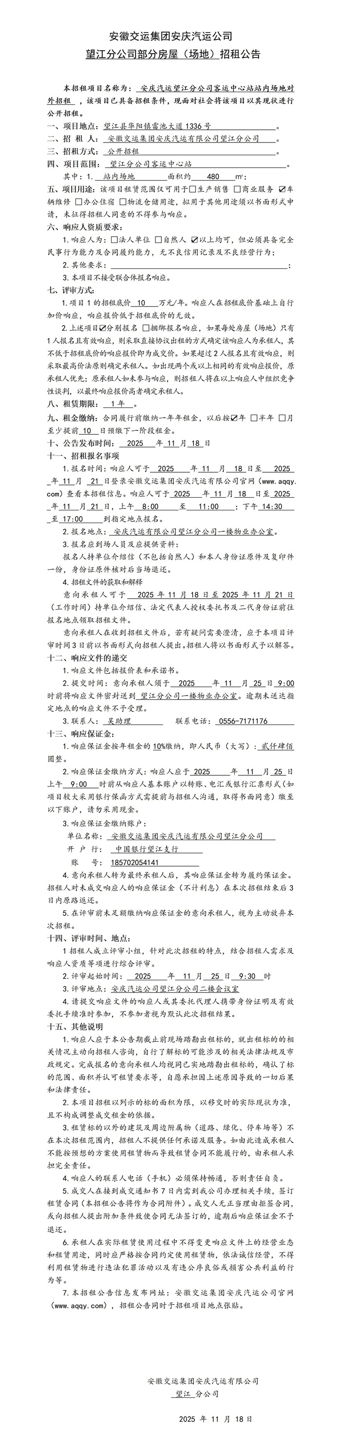 望江分公司部分房屋(場(chǎng)地)招租公告