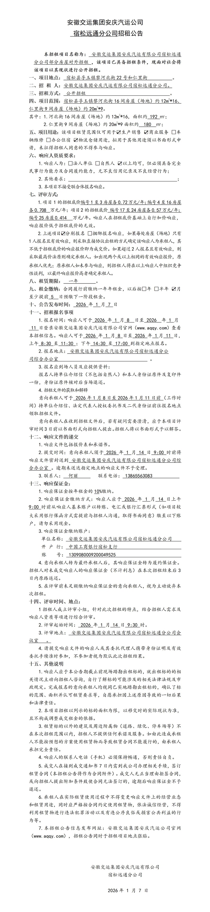 宿松遠通分公司部分房屋對外招租