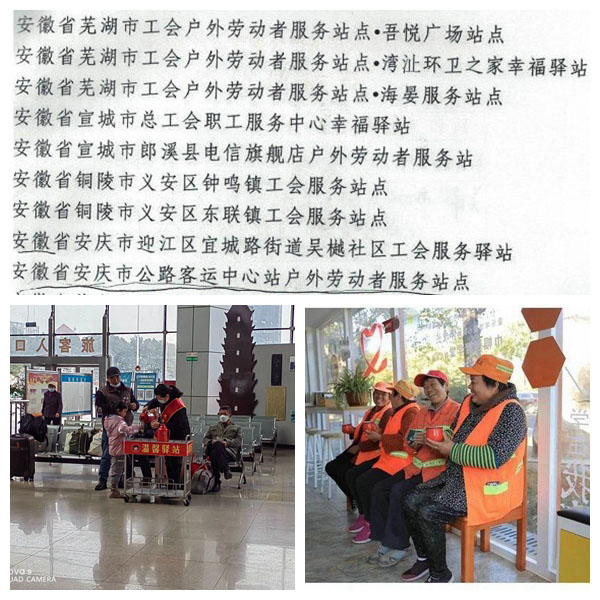 “清涼一夏,供一片陰涼,送一杯涼茶;溫暖一冬,辟一處歇腳,送一杯熱水”。 2019年9月以來,安慶公路客運(yùn)中心站精心打造戶外勞動站點,該服務(wù)站點配備了愛心專椅、飲水機(jī)、冷暖設(shè)備、應(yīng)急藥箱(配備常用藥)、充電設(shè)備、雨傘等基本設(shè)施,為戶外勞動者提供休息、飲水、充電、避雨、納涼等便民利民服務(wù),讓周邊工作的環(huán)衛(wèi)工人、民警、的哥、外賣小哥等戶外工作者提供了臨時休息場所,讓他們在辛勞之余感受到“家”的溫暖。