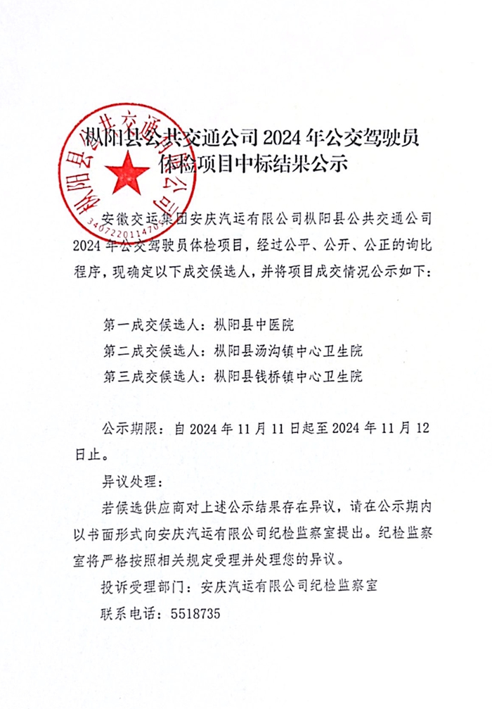 樅陽公交駕駛員2024年體檢項目中標公告